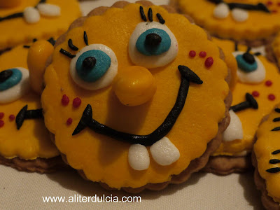 Como podréis comprobar, el fondant no es lo mío, ni domino la técnica ni me pertrecho con los utensilios necesarios, uso el "método manual", ese que consigue unas cinco primeras galletas, llamémosles pasables, y unas cinco últimas en las que uno ya no distingue a Bob Esponja de Benjamin Roosevelt.